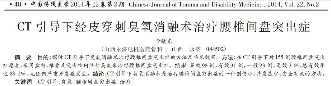 臭氧是良好的氧化剂,具有很强的氧化能力,注入椎间盘髓核后,可直接化蛋白多糖复合体,导致其水分丢失,髓核细胞干涸、变性,椎间盘萎缩,解除对硬膜囊及神经根的压迫。臭氧还具有消除无菌性炎症、镇痛、消除粘连等作用。