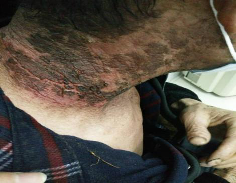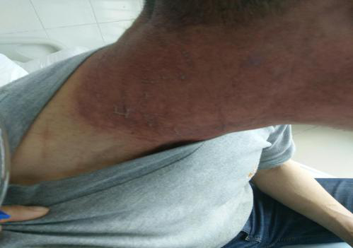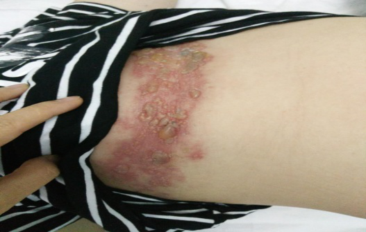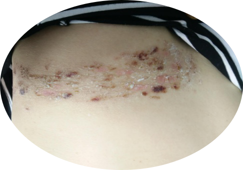 患者潘某某,女,71岁,右侧肩背、侧胸臂部烧灼性疼痛10+天入院,入院诊断为带状疱疹,入院后感疼痛难忍,夜间难以入睡。经三氧大自血3次后疼痛明显缓解,水疱明显消退,结痂。