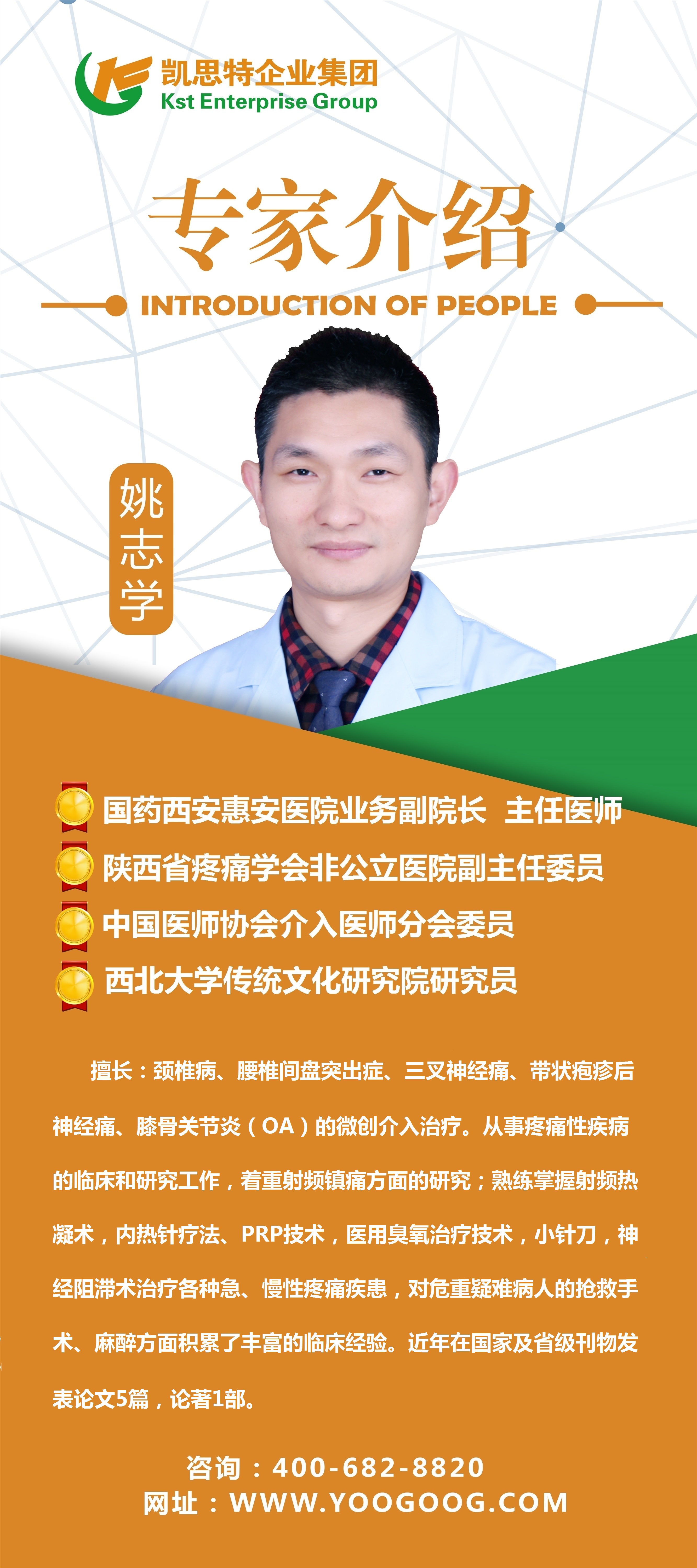 姚志学 ,国药西安惠安医院业务副院长,主任医师,西北大学传统文化研究院研究员、中国医师协会介入医师分会委员、西安医学会针法微型外科分会常务委员、陕西省干细胞学会风湿免疫专业委员会常务委员、中国民族医药学会常务理事、白求精神研究康复医学分会常务理事、陕西保健学会脊柱与关节疼痛专业委员、陕西省疼痛学会非公立医院副主任委员。